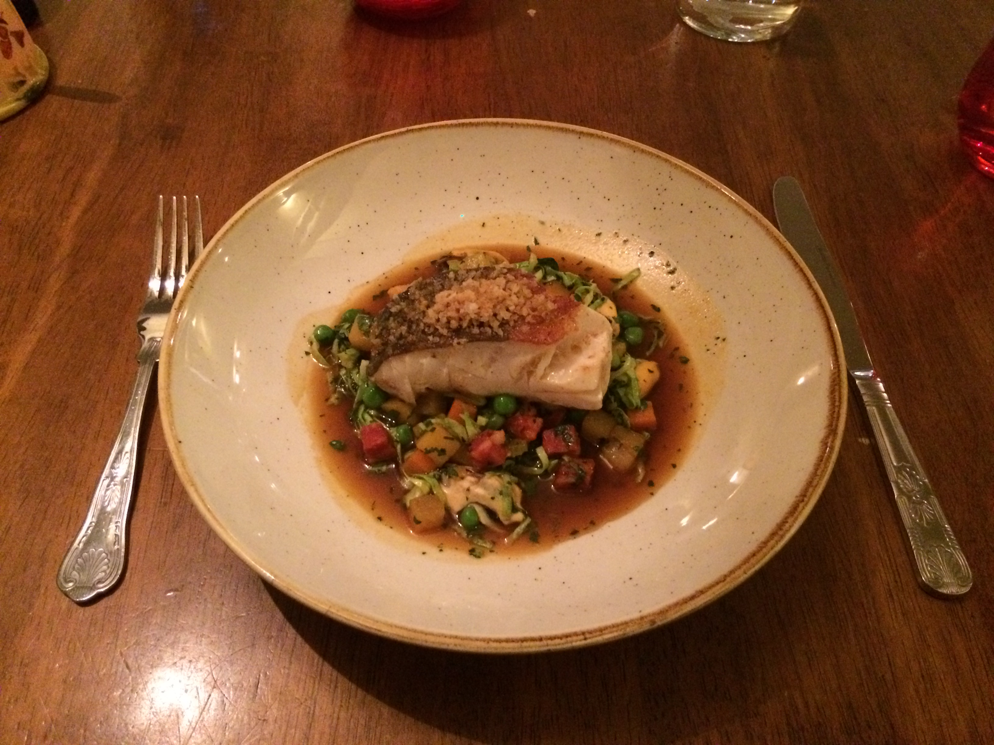 Previous Image Next Image IMG_3415 Rost Cornish Cod With Saffron Potato Broth, Peas, Chorizo And Mussels.